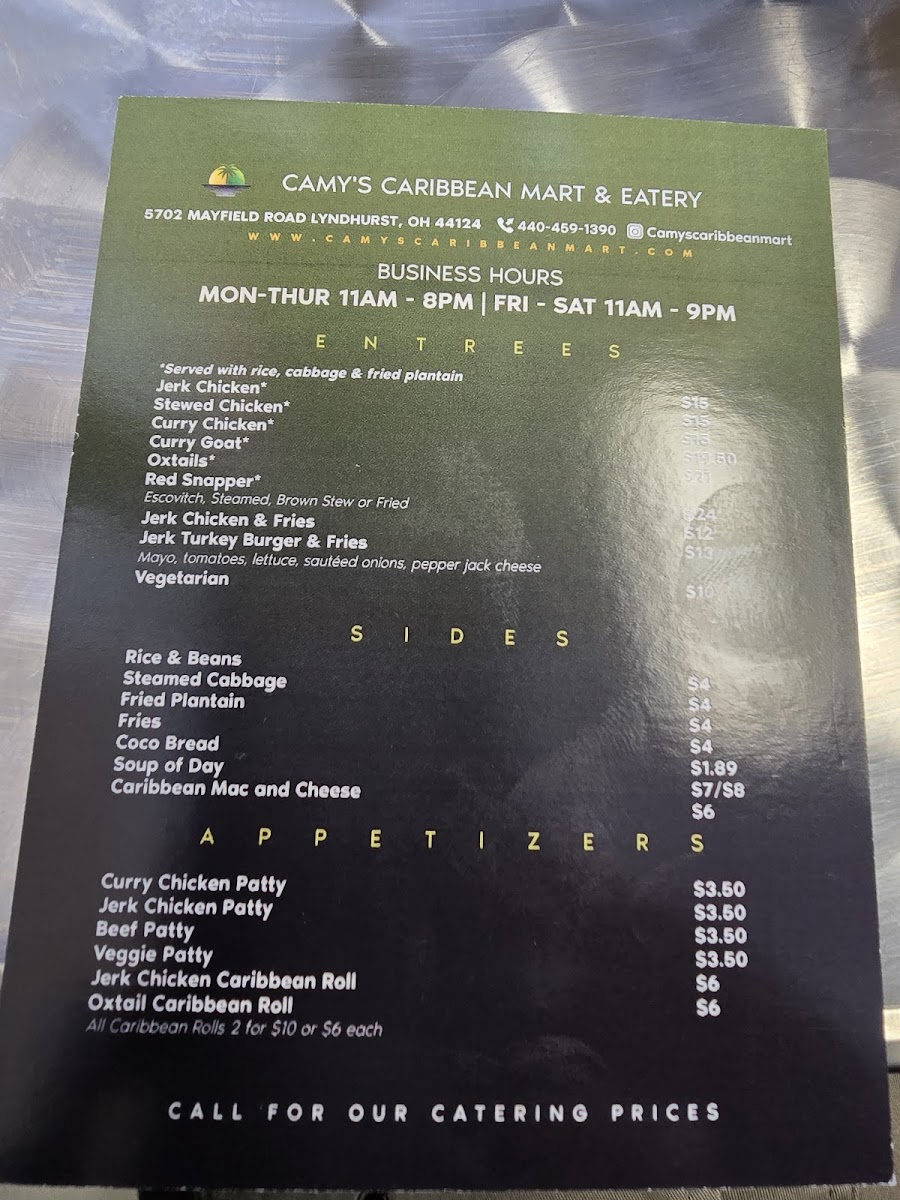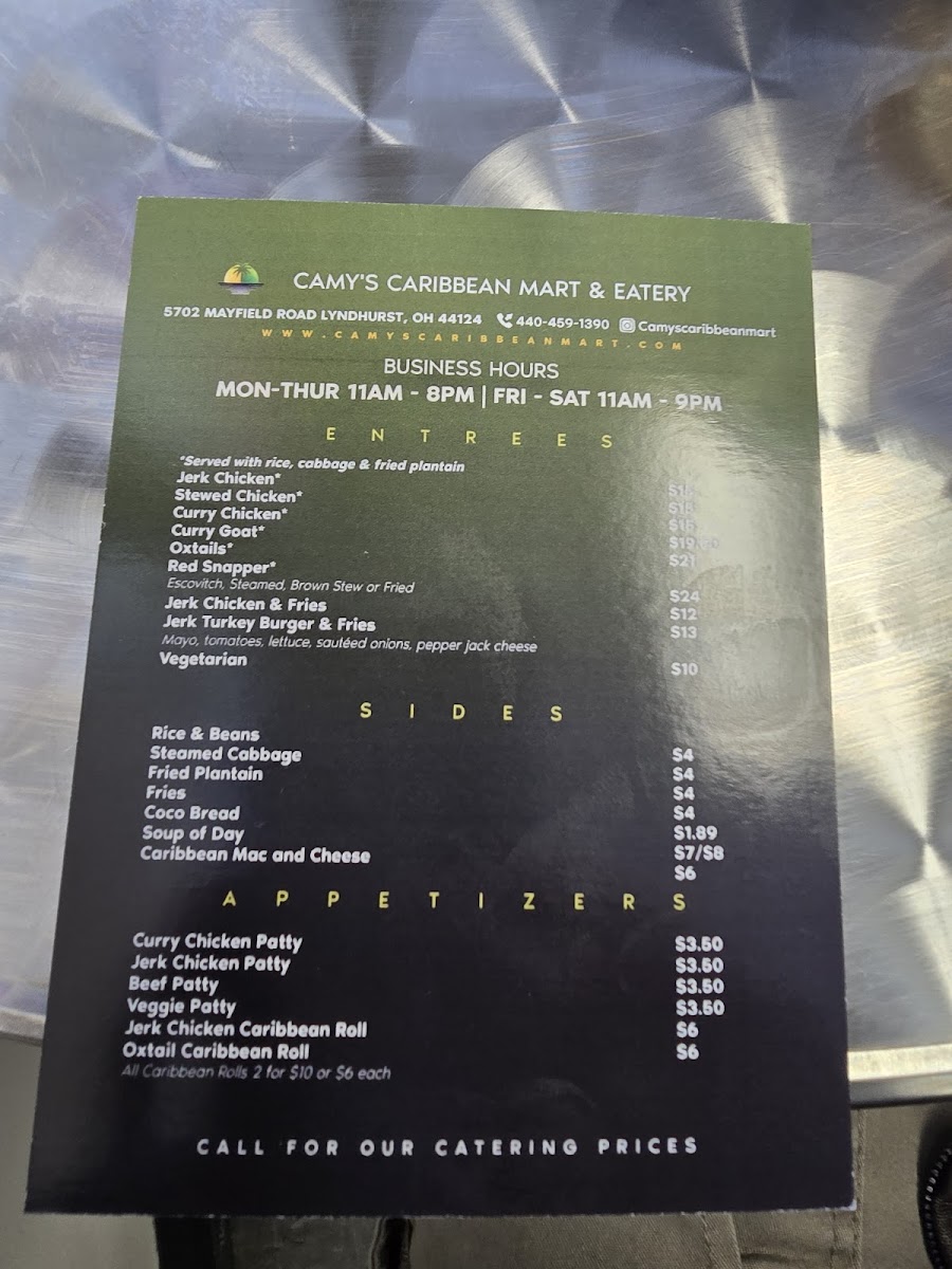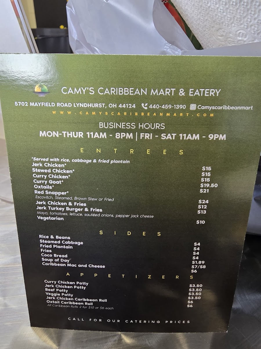 The menu at Camy's Caribbean Mart & Eatery, located at 5702 Mayfield Rd, delivers a focused snapshot of Caribbean comfort food that balances bold seasoning with straightforward, satisfying sides and a simple dessert finish. At the heart of the offering is Jerk Chicken & Fresh Cut Fries, a pairing that highlights the kitchen’s strength: deeply spiced, aromatic jerk flavors matched with freshly cut fries that add a familiar, hearty contrast. The chicken carries the warmth and smokiness expected from jerk preparation, while the fries keep the plate grounded and filling, making it an easy go-to for both first-time visitors and regulars.